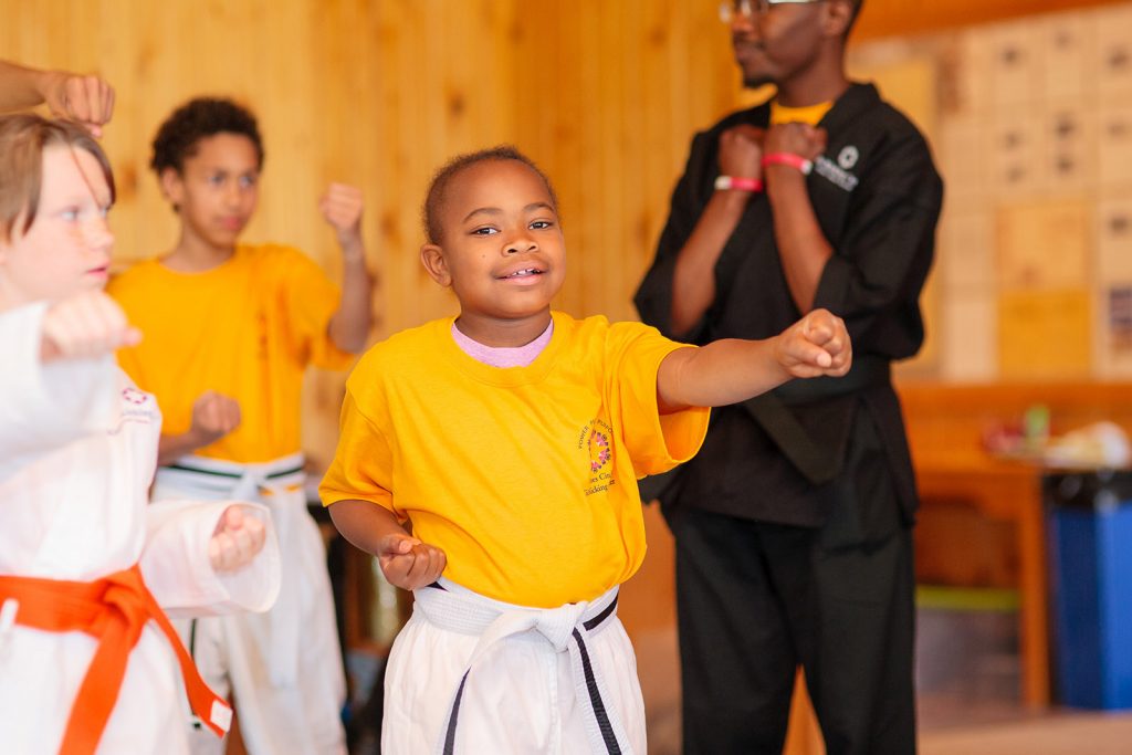 When Grace was diagnosed with cancer at 7 years old she was very withdrawn. She was depressed & lacking confidence. She didn’t want to come to Kids Kicking Cancer class. Cindy encouraged the family to try out some of the family support outings in the meantime. She explained that if Grace made friends she would want to come to class. She was right. The more Grace participated you could see her confidence increase. She became so confident that she was even willing to tell her story of how the program has helped her in front of hundreds of people at Camp Michigania.