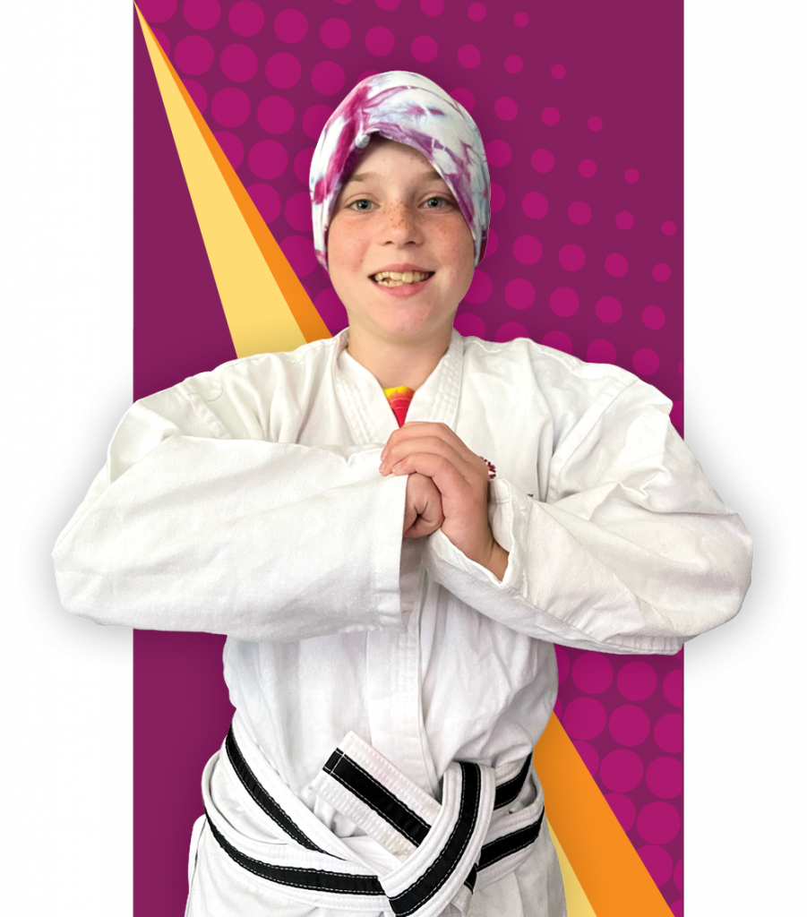 Meanwhile, the Heroes Circle has become an extra-curricular activity for Natalee. The classes provide a safe, fun outlet for Natalee, who giggles as she tells stories about joking with her Sensei’s Michael and Peter. In fact, Natalee’s last name—Laughton—seems spot-on for a girl fighting cancer with smiles and laughter. Robert notes that in many ways, Natalee has been a shy girl. He’s witnessed his daughter come out of her shell through the Heroes Circle. “Classes bring a smile to her face, which is nice…I think it’s helped bring out Natalee and her confidence.” This confidence has brought out not just Natalee’s humor, but an ability to tackle chemotherapy treatments head on. “She just rolls with it,” says Robert. Natalee loves her Power Breathing, but says that if someone had told her that breathing in light and happy thoughts would be helpful, “I’d have just thought they were crazy!” Still, she acknowledges that at one point, she was not thinking good thoughts, but thoughts that made her feel scared. Natalee’s advice today to other kids going through similar trials? “Think of something happy.”